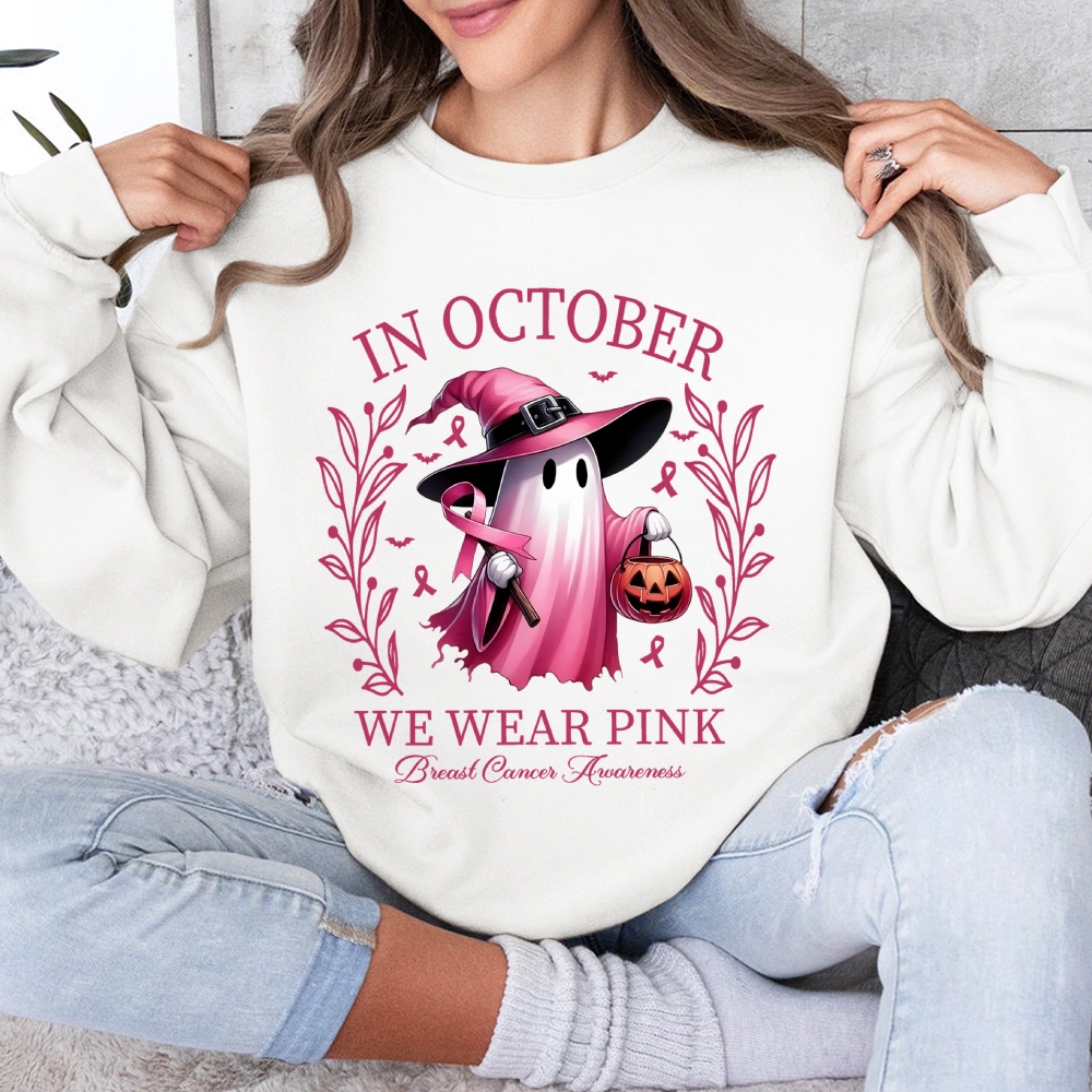 Halloween Beautifully Ghost Picture Breast Cancer Awareness Cotton Pullover Sweatshirt