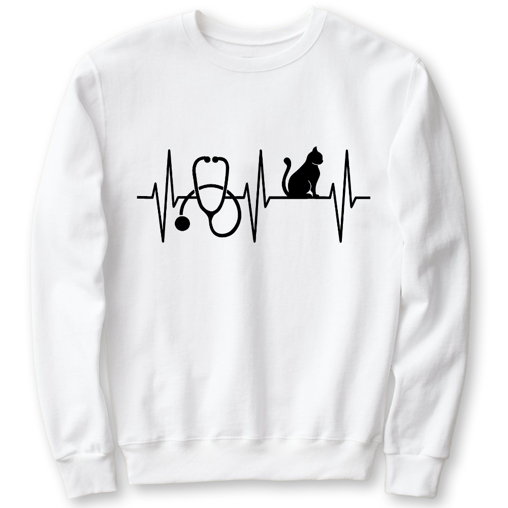 Stethoscope & ECG & Cat Print Cotton Pullover Sweatshirt