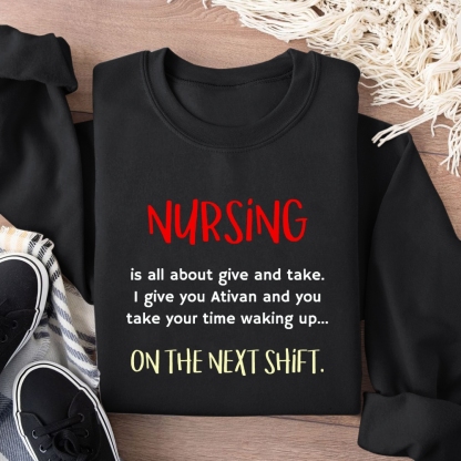 Funny Nurse Statement Nursing Is All About Give And Take Cotton Pullover Sweatshirt