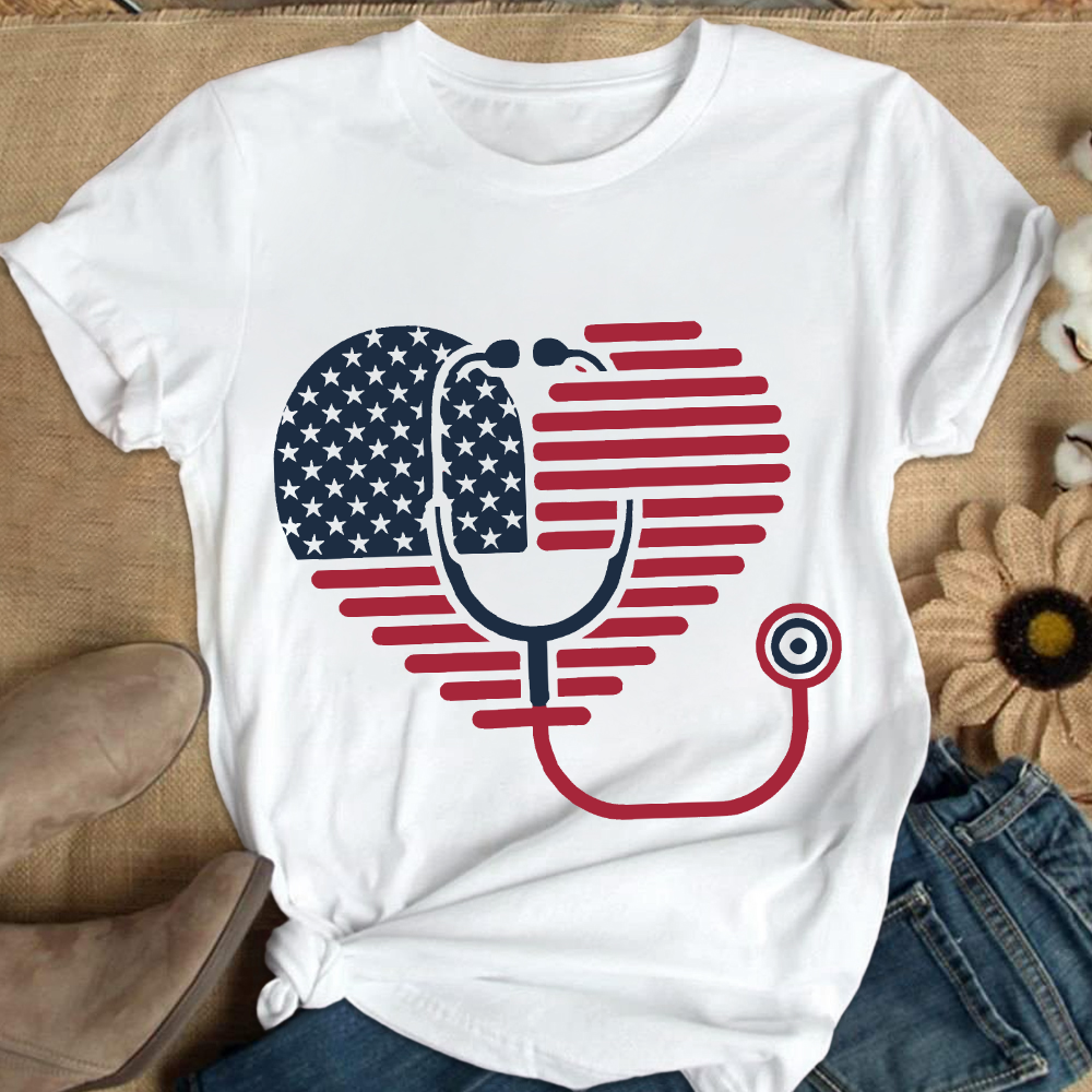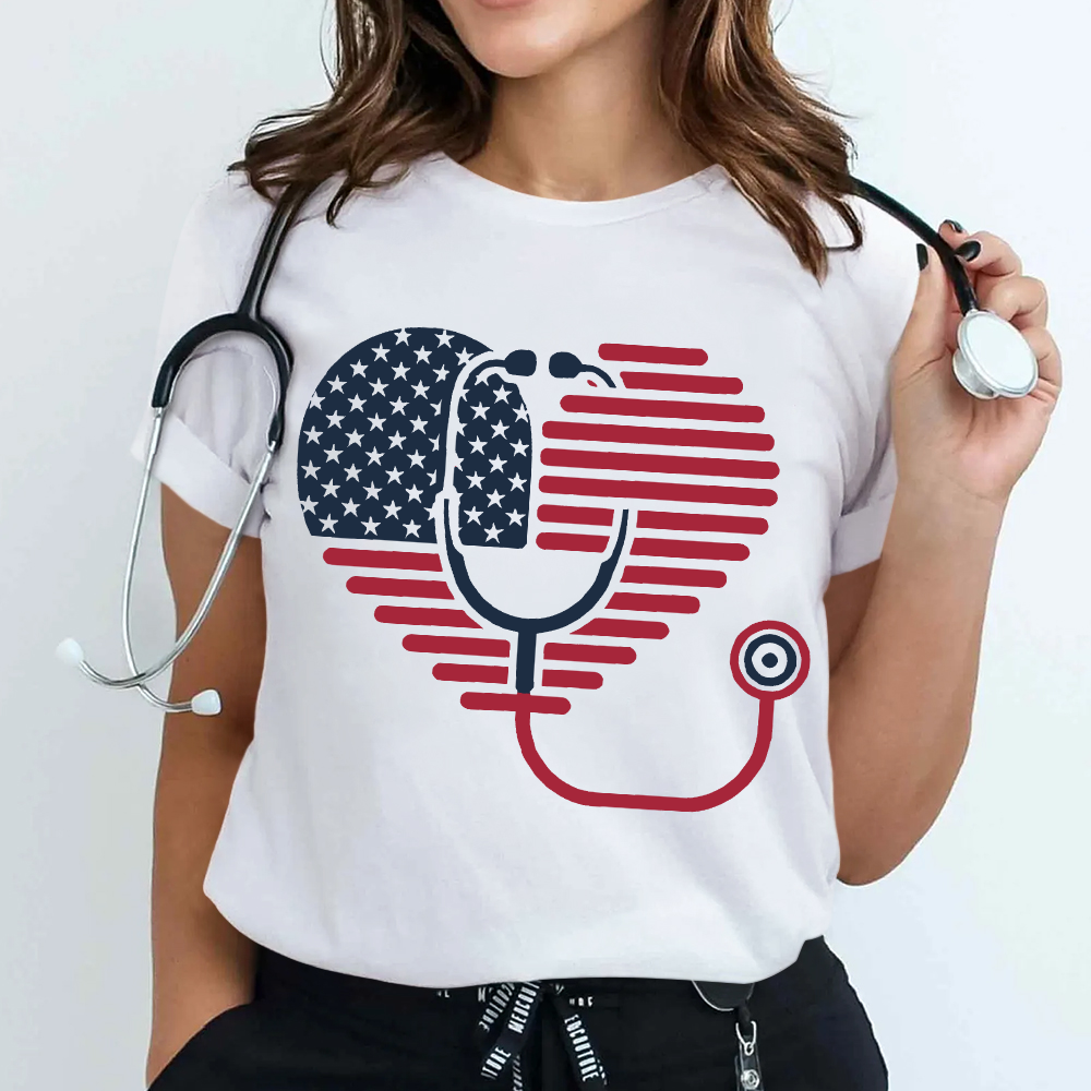 American Flag Stethoscope Medical Heart Cotton Nurse T-shirt
