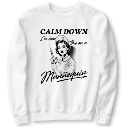 Calm Down I've Done This on a Mannequin Cotton Pullover Sweatshirt
