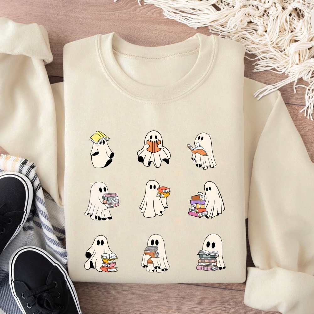 Cute Ghost Reading Cotton Pullover Sweatshirt