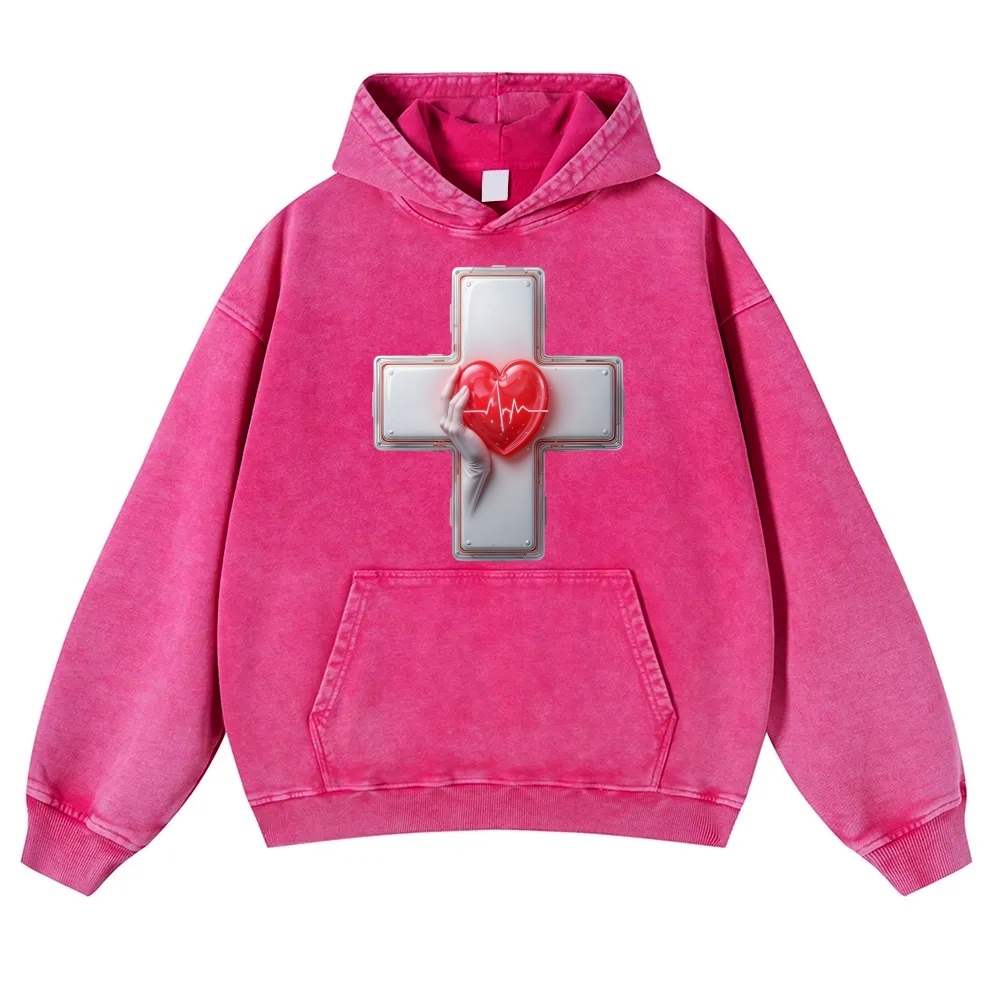 Gloved Hand Holding Red Heart with ECG Line and White Cross Vintage Washed Hoodie