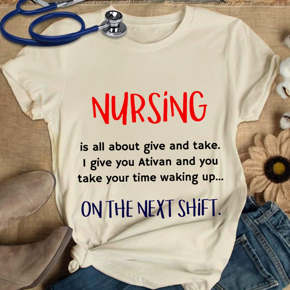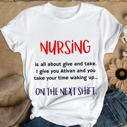 Funny Nurse Statement Nursing Is All About Give And Take Cotton Nurse T-shirt