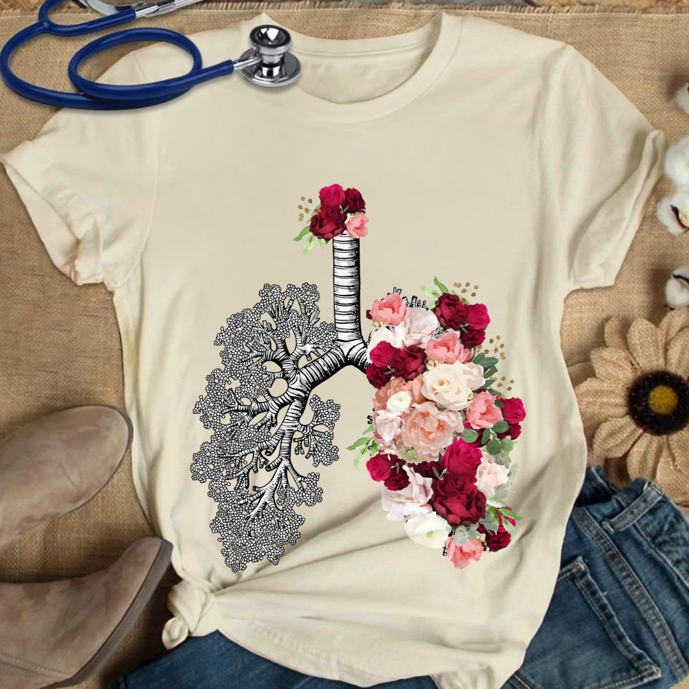 Bloom Dark Roses Floral Anatomy Watercolor Lungs Cancer Awareness Cotton Nurse T-shirt