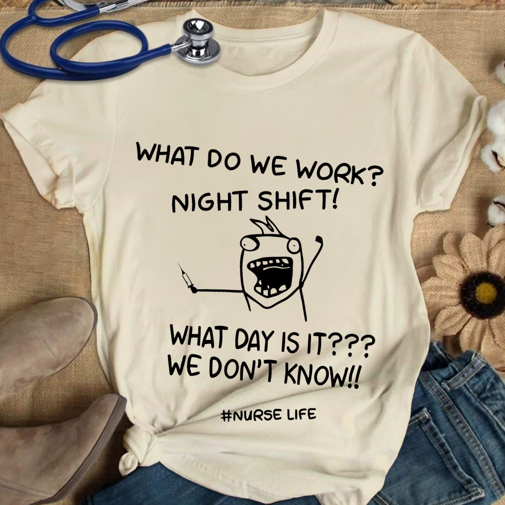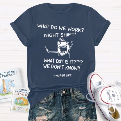 What Do We Work-Night Shift What Day Is It-We Don't Know Cotton Nurse T-shirt